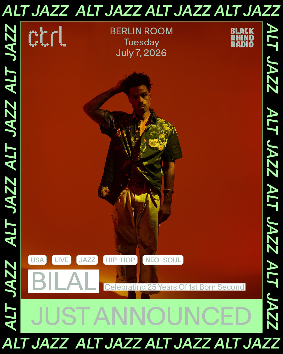 We come in strong with another booking for Control's [Alt Jazz] series - announcing Grammy Award-winning artist Bilal, on July 7.